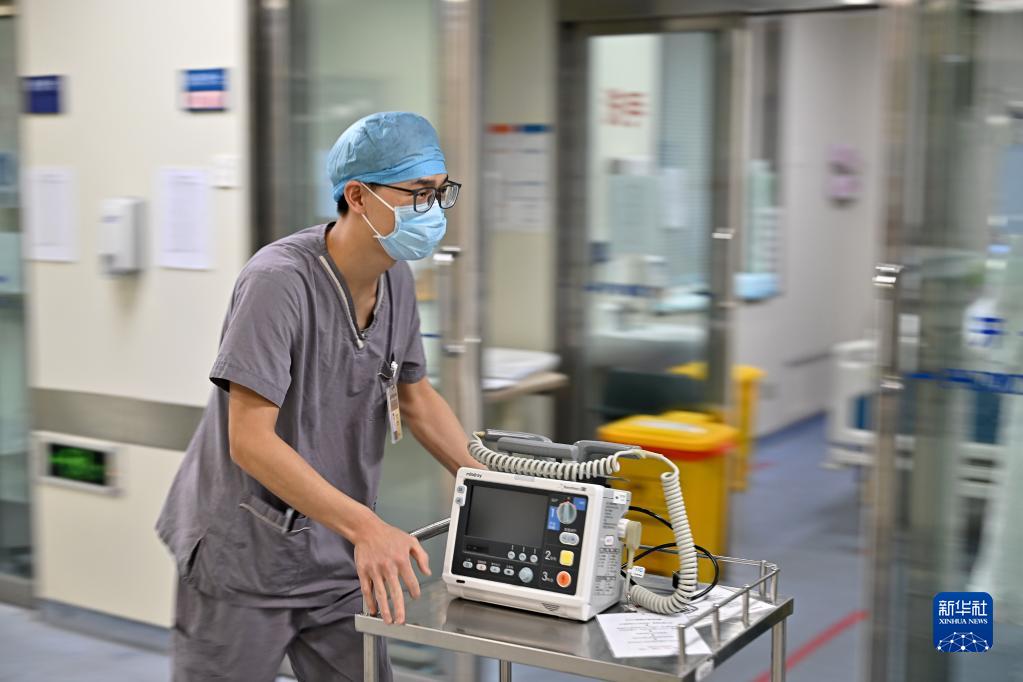 5月11日4時(shí)許,北京協(xié)和醫院內科重癥監護病房(MICU)護士郭宏偉運送除顫儀。