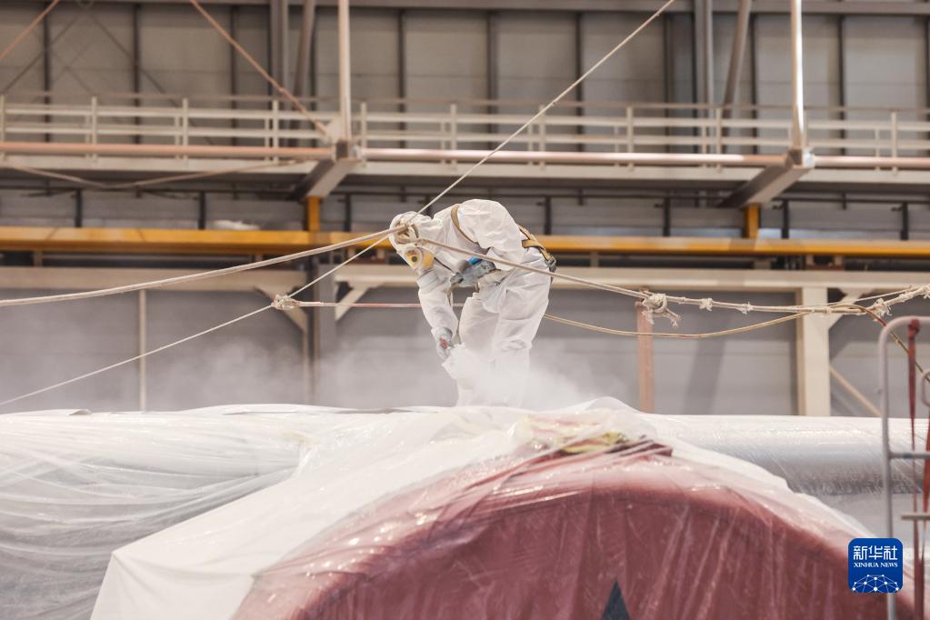 5月11日,噴涂作業(yè)員對空客A350-900寬體客機進(jìn)行油漆噴涂。