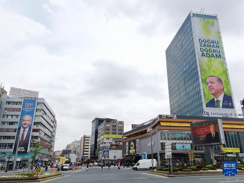 這是5月11日在土耳其安卡拉拍攝的埃爾多安(右)和凱末爾·克勒奇達爾奧盧的競選海報(手機拍攝)。