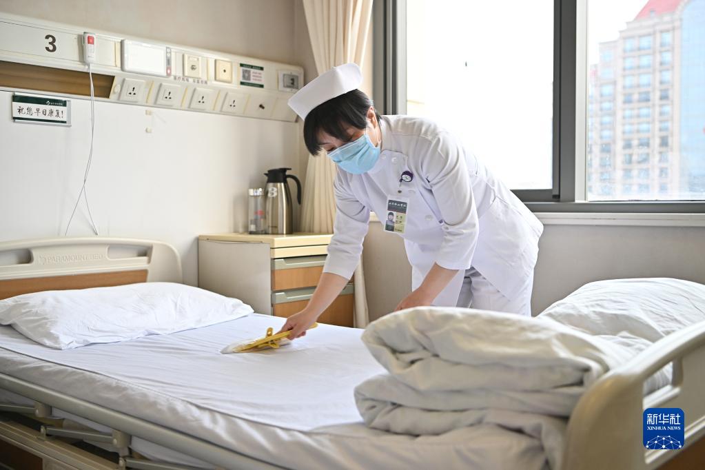 5月11日6時(shí)許,北京協(xié)和醫院基本外科四病房護士程瑤做晨間護理時(shí)清潔床單。