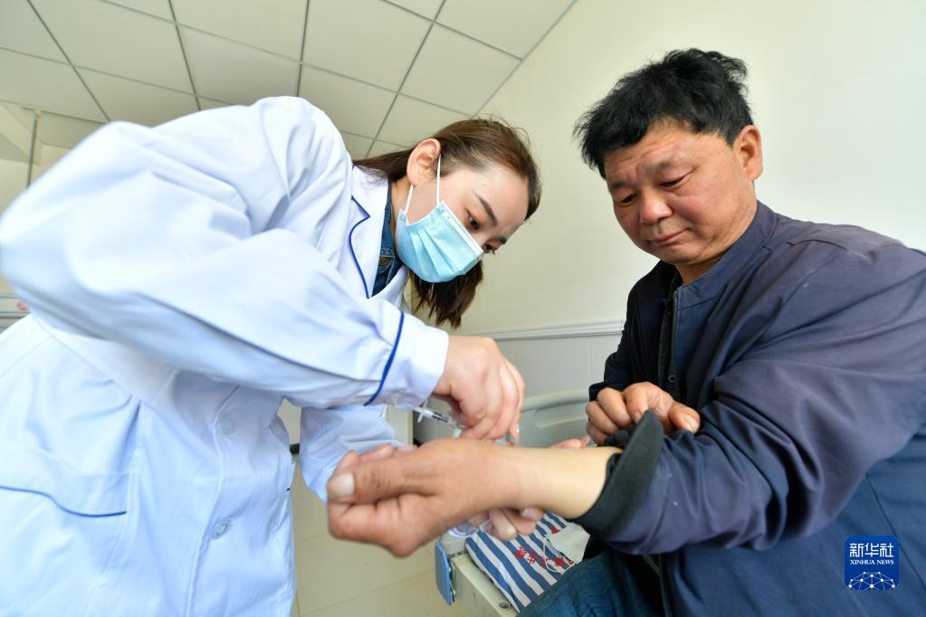 在武都區桔柑鎮衛生院住院部病房,李瑞(左)給患者做皮試(5月11日攝)。
