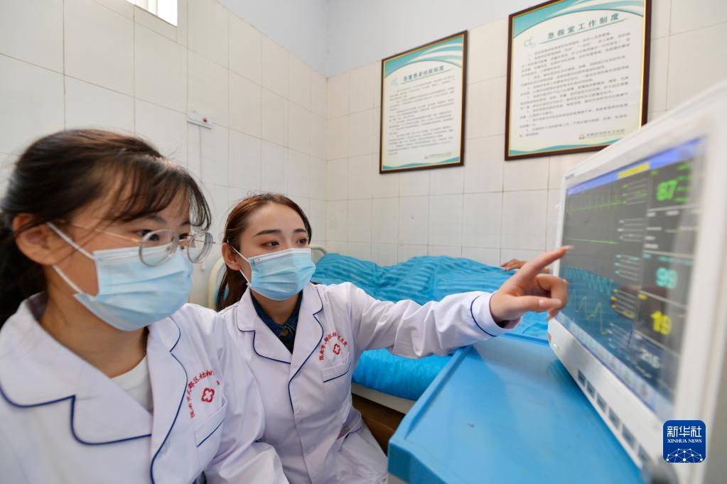 在武都區桔柑鎮衛生院,李瑞(右)給同事講解心電監護儀各項數值正常范圍(5月11日攝)。
