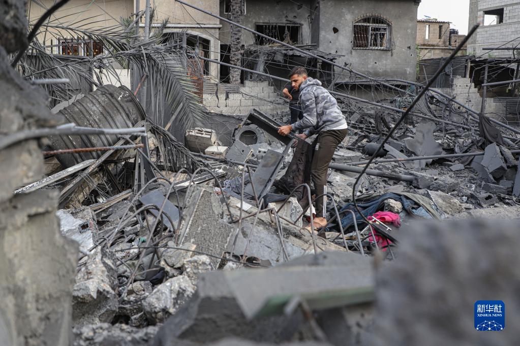 5月11日,在加沙地帶拜特拉希亞,一名男子檢查空襲后的自家房屋廢墟。