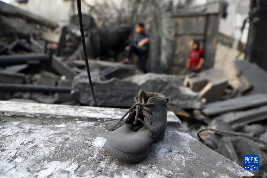 這是5月11日在加沙地帶拜特拉希亞拍攝的空襲后的建筑廢墟上的一只鞋。