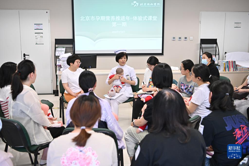 5月9日10時(shí)許,北京協(xié)和醫院產(chǎn)科門(mén)診護士長(cháng)李蕊(中)在孕婦學(xué)?;顒?dòng)中與來(lái)院交流的產(chǎn)科醫護人員及孕婦交流護理技巧。