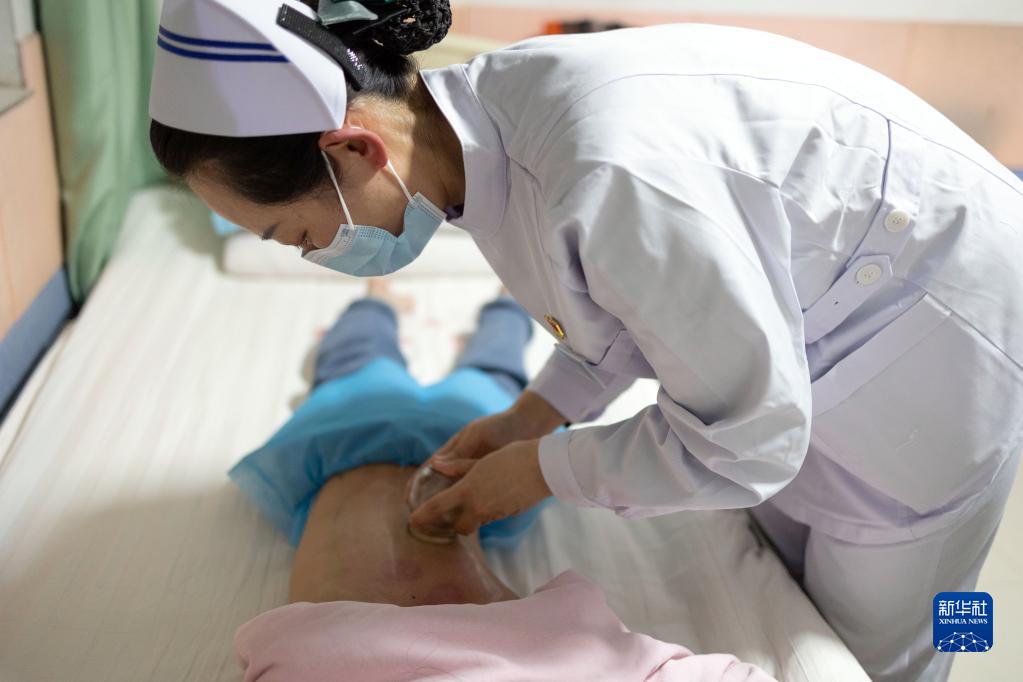 5月8日晚,渭南腦病康復醫院的一名護士在為患兒進(jìn)行平衡火罐治療。