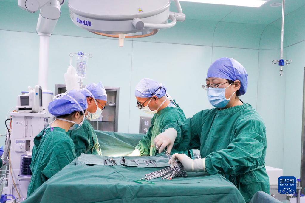 王曉杰(右一)在手術(shù)室協(xié)助醫生對患兒進(jìn)行手術(shù)(5月10日攝)。