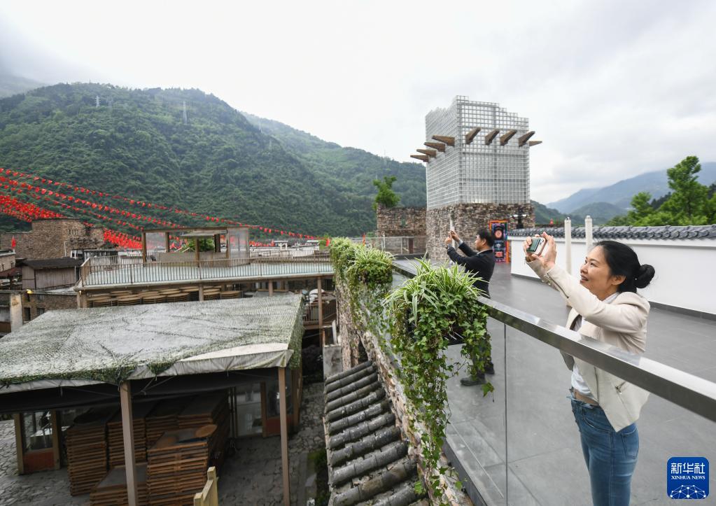 5月8日,在四川省汶川縣映秀鎮,鐘朝輝和曲海望(右)用手機拍攝映秀鎮的風(fēng)光。