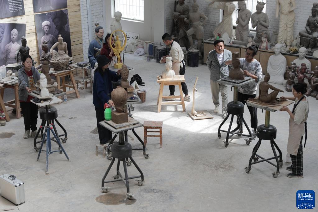 5月11日,學(xué)員在位于敦煌市的莫高里工匠村學(xué)習雕塑技藝。