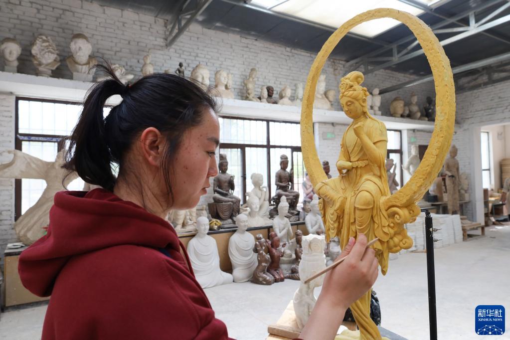 5月11日,學(xué)員在位于敦煌市的莫高里工匠村學(xué)習雕塑技藝。