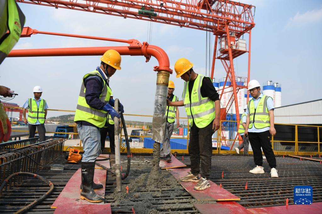 5月12日,中國鐵建大橋局施工人員在新建滬寧合高鐵安徽段首榀箱梁澆筑現場(chǎng)作業(yè)。
