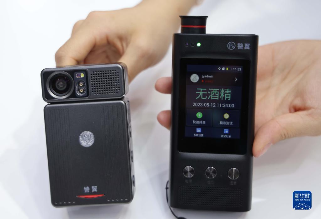 5月12日,工作人員在展示5G警翼執法記錄儀(左)和酒檢儀。