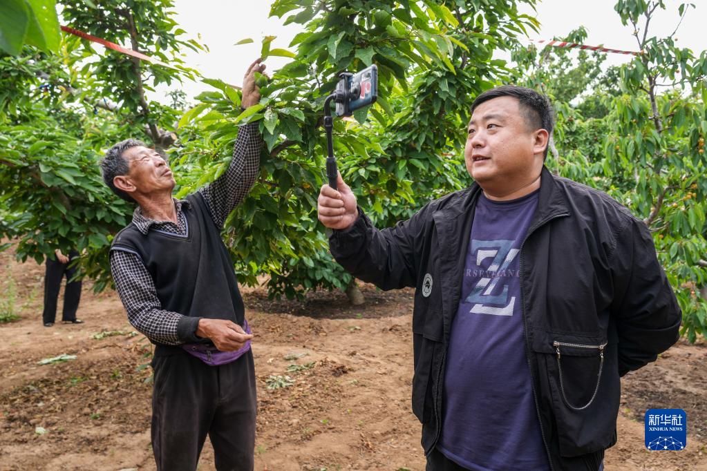 5月12日,五峰山街道西石村黨支部書(shū)記董凱(右)發(fā)揮特長(cháng),為村民種植的櫻桃做網(wǎng)絡(luò )推廣。