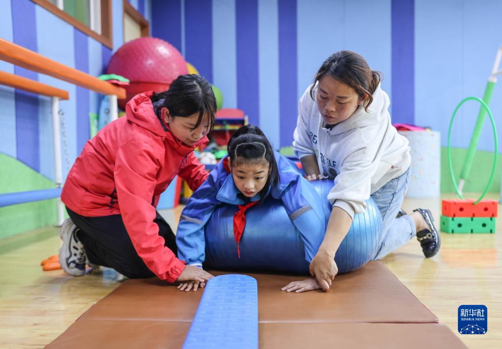 在陜西省渭南市特殊教育學(xué)校的感覺(jué)統合室,王鴿(右)和老師一起幫助趙懿菲進(jìn)行訓練(5月9日攝)。