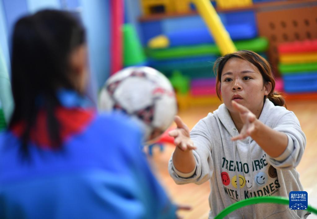5月9日,在陜西省渭南市特殊教育學(xué)校的感覺(jué)統合室,王鴿協(xié)助女兒趙懿菲進(jìn)行感統訓練。