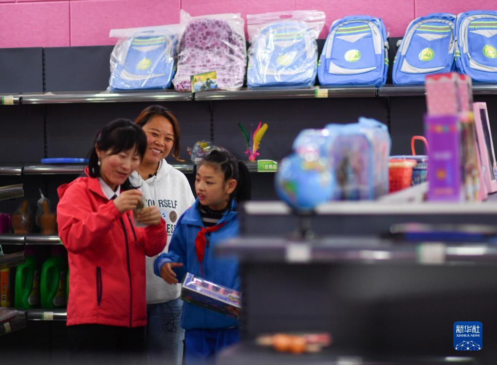 5月9日,在陜西省渭南市特殊教育學(xué)校的情景超市內,王鴿(中)陪同女兒趙懿菲(右)在老師指導下練習購買(mǎi)商品。