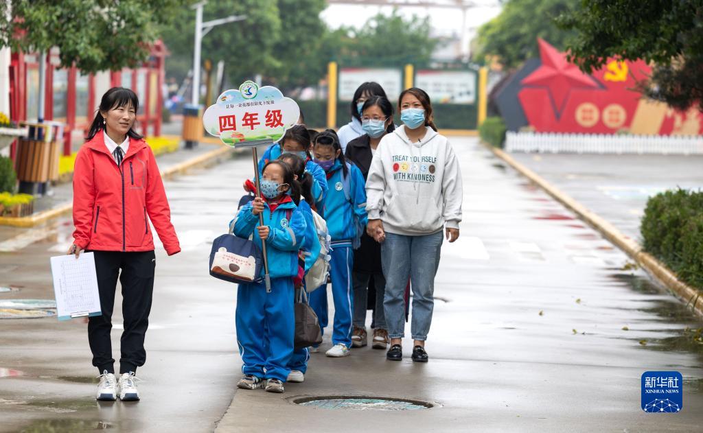 5月9日,在陜西省渭南市特殊教育學(xué)校,王鴿(右一)牽著(zhù)小懿菲的手在放學(xué)后列隊離校。