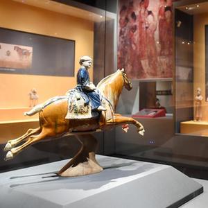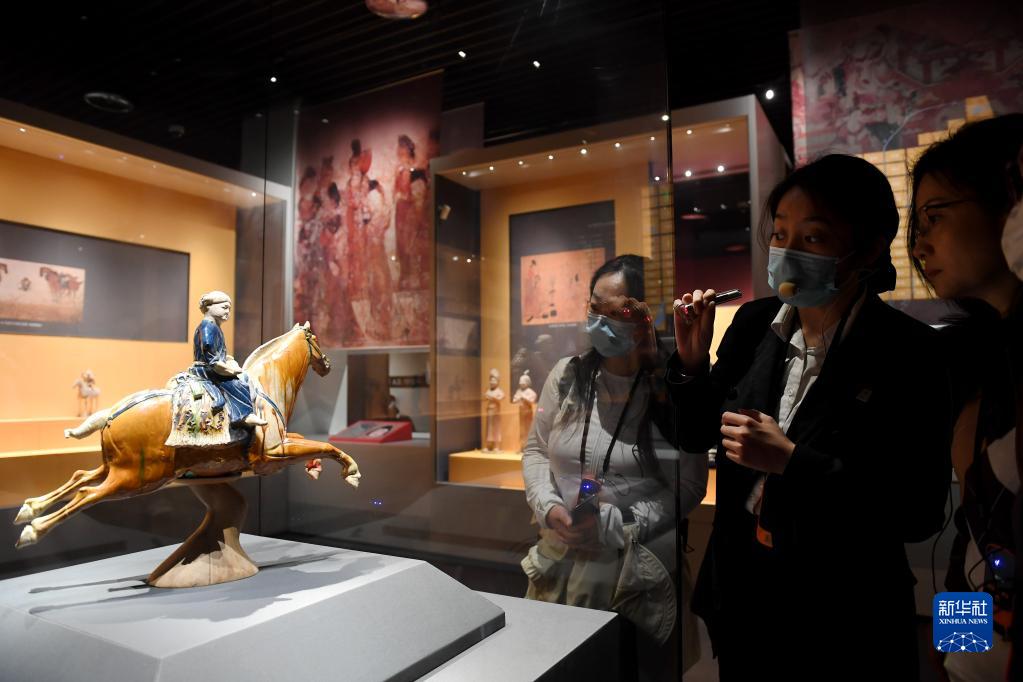5月8日,游客在西安博物院參觀(guān)唐代三彩騰空馬。飛騰的三彩馬上騎有一胡俑,真實(shí)再現了絲綢之路上西域胡人急奔長(cháng)安的生動(dòng)形象。