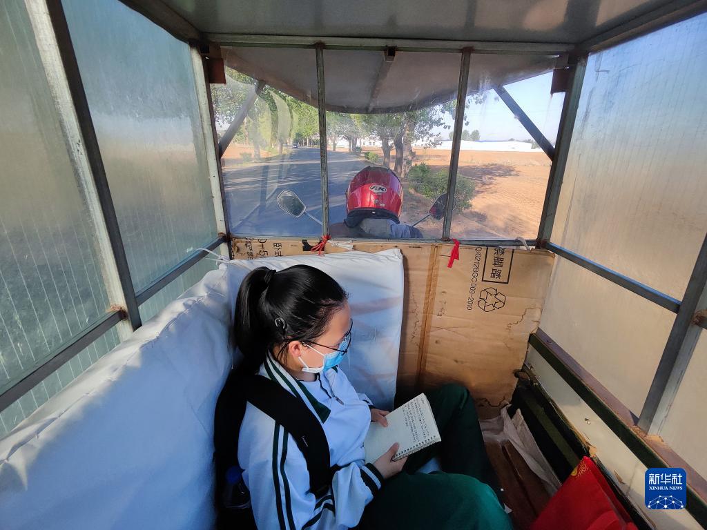 清晨,張連琴騎著(zhù)電動(dòng)三輪車(chē)拉著(zhù)女兒李昕偉去上學(xué),女兒在車(chē)棚內背誦詩(shī)詞(5月8日手機拍攝)。