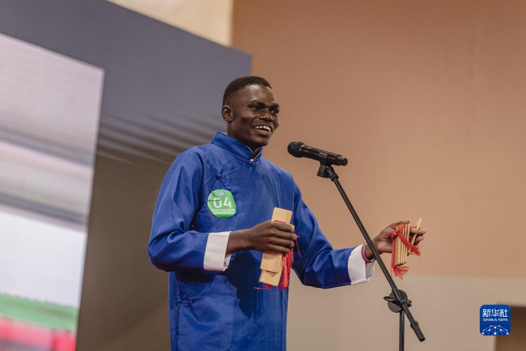 5月12日,在肯尼亞內羅畢大學(xué),來(lái)自?xún)攘_畢大學(xué)孔子學(xué)院的阿莫斯·阿瓜塔·米齊拉表演快板。該選手最終榮獲第一名。