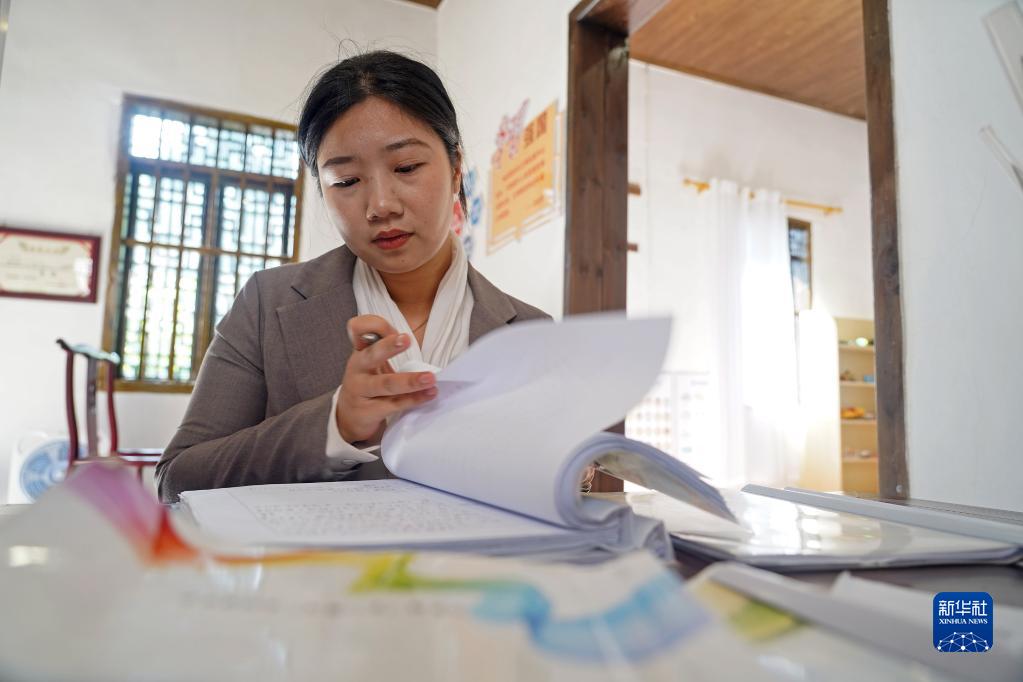 在江西省贛州市南康區盧屋村“童心港灣”,“童伴媽媽”盧婕在整理家訪(fǎng)記錄(4月26日攝)。