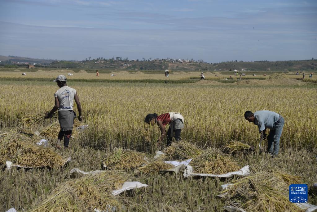 5月12日,在馬達加斯加首都塔那那利佛附近馬希奇鎮的中國國家雜交水稻工程技術(shù)研究中心非洲分中心,當地農民在雜交水稻高產(chǎn)示范田內收割水稻。