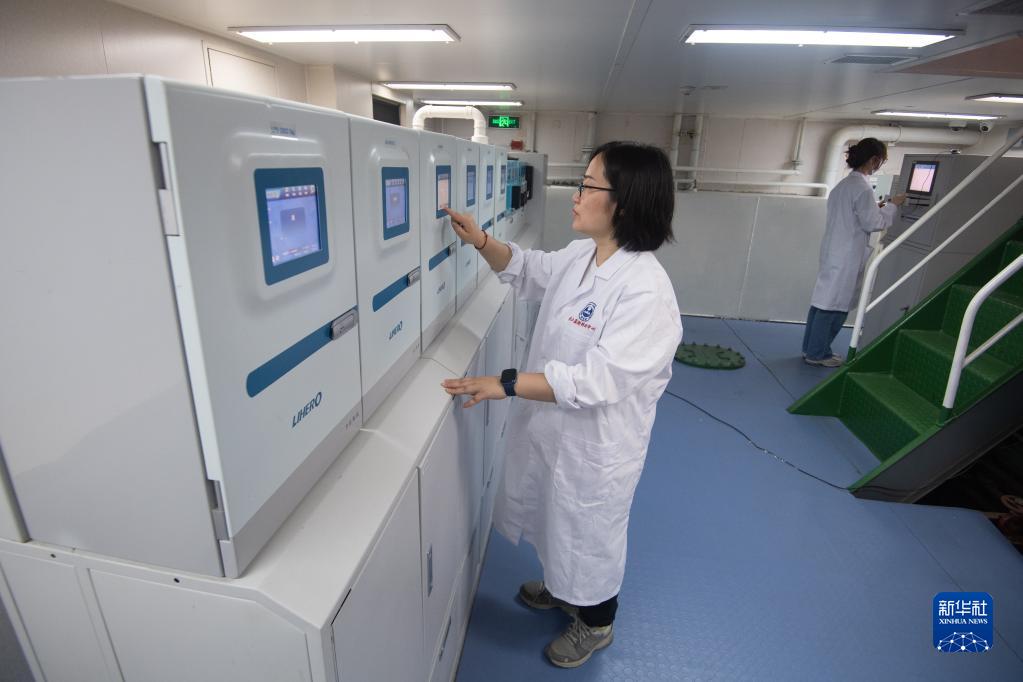 5月13日,監測人員在實(shí)驗室操作船載水質(zhì)自動(dòng)監測設備。