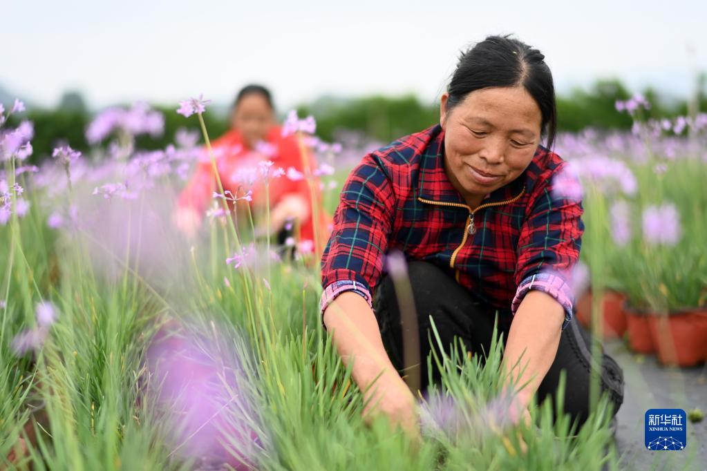 5月13日,村民在貴州省黔東南苗族侗族自治州黃平縣舊州鎮文峰村花卉基地管護紫嬌花。