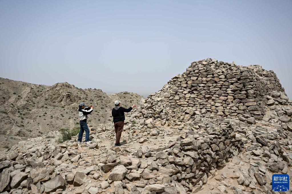 5月13日,駝峰(長(cháng)城)文物保護隊員娜仁圖雅(左)和烏仁其其格在巡查阿拉善左旗一處烽火臺遺址。