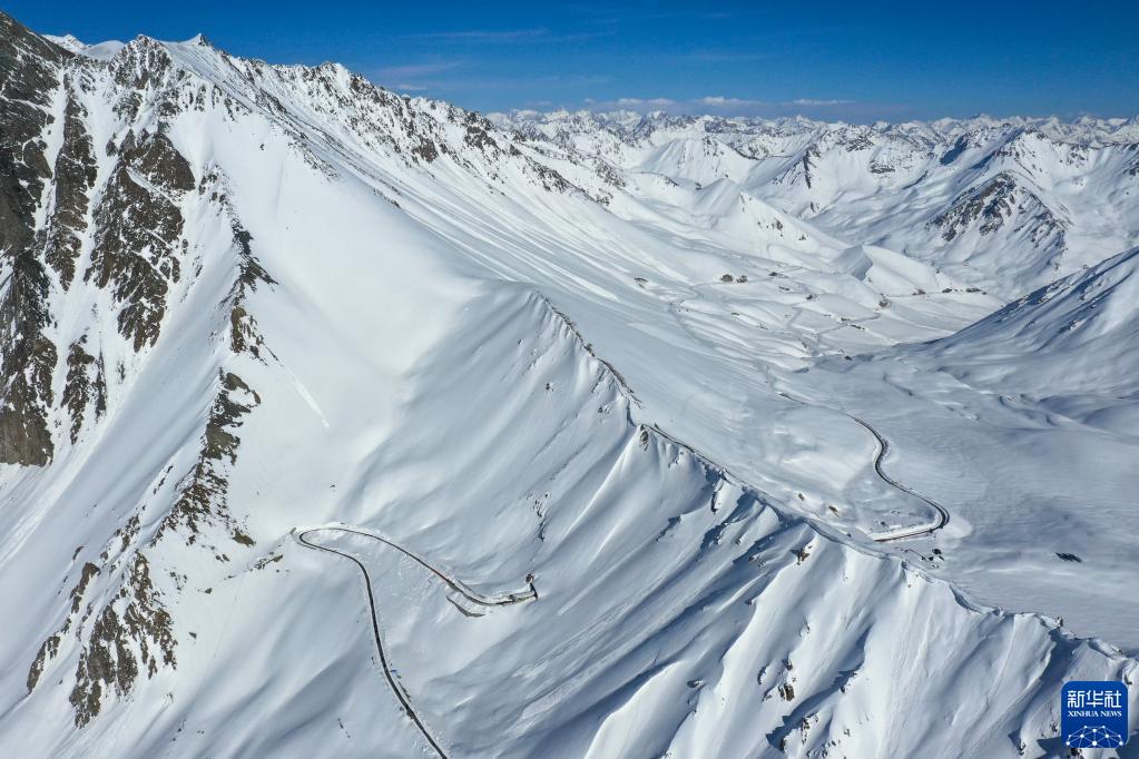 新疆獨庫公路上海拔超過(guò)3400米的哈希勒根達坂,哈希勒根隧道穿越山體,連接山之南北(5月10日攝,無(wú)人機照片)。