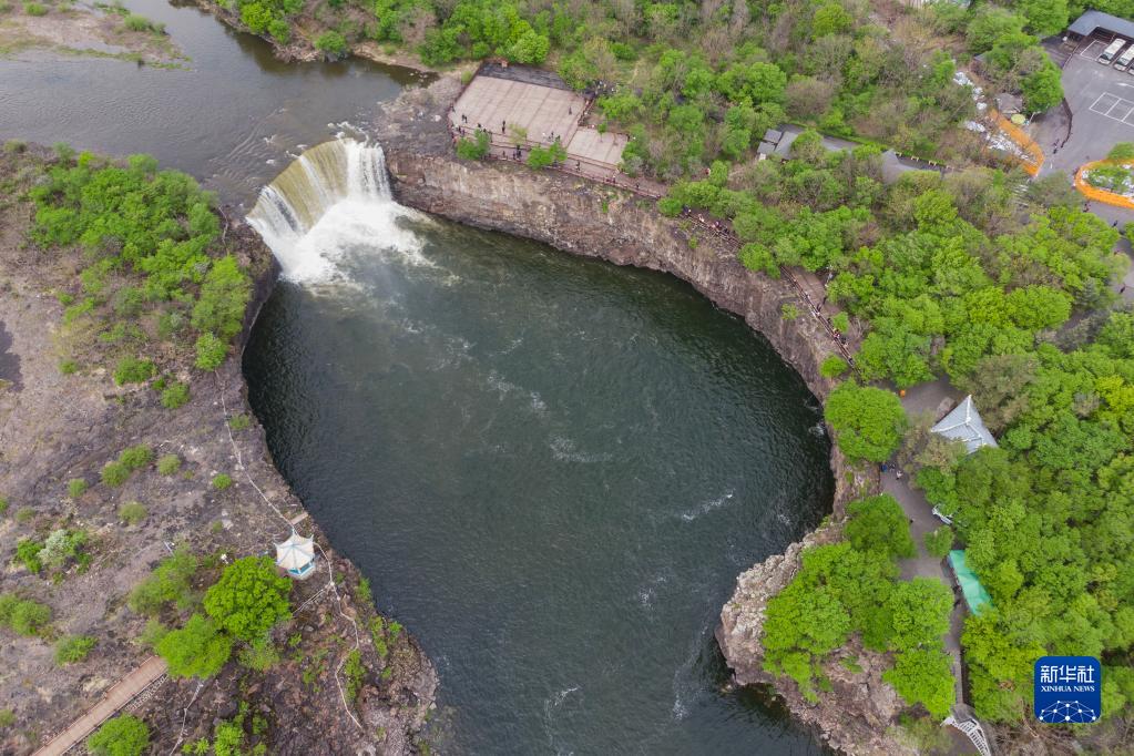 這是5月14日在黑龍江省牡丹江市拍攝的鏡泊湖世界地質(zhì)公園吊水樓瀑布(無(wú)人機照片)。