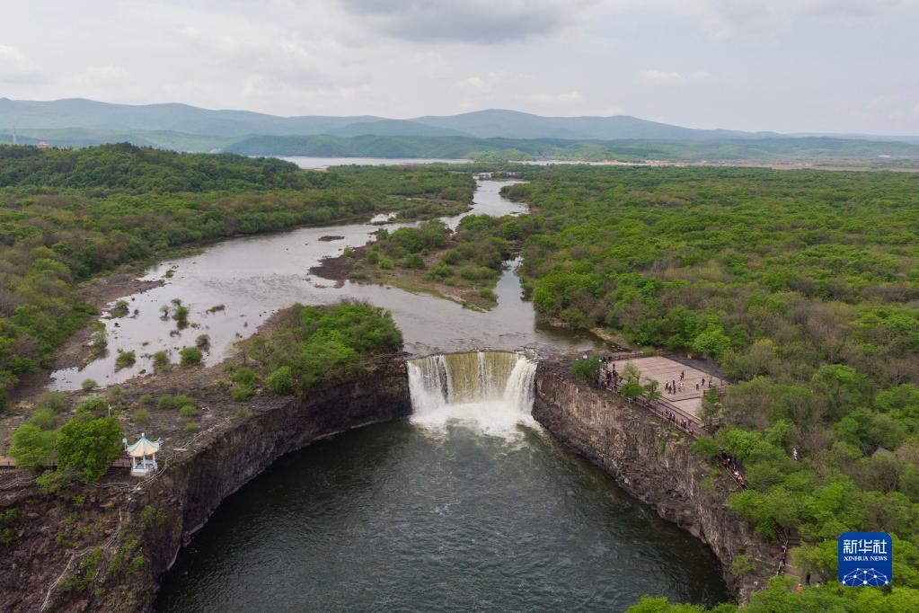 這是5月14日在黑龍江省牡丹江市拍攝的鏡泊湖世界地質(zhì)公園吊水樓瀑布(無(wú)人機照片)。