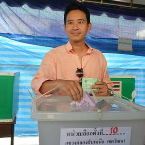 5月14日,泰國為泰黨總理候選人貝東丹在曼谷一處投票站投票。