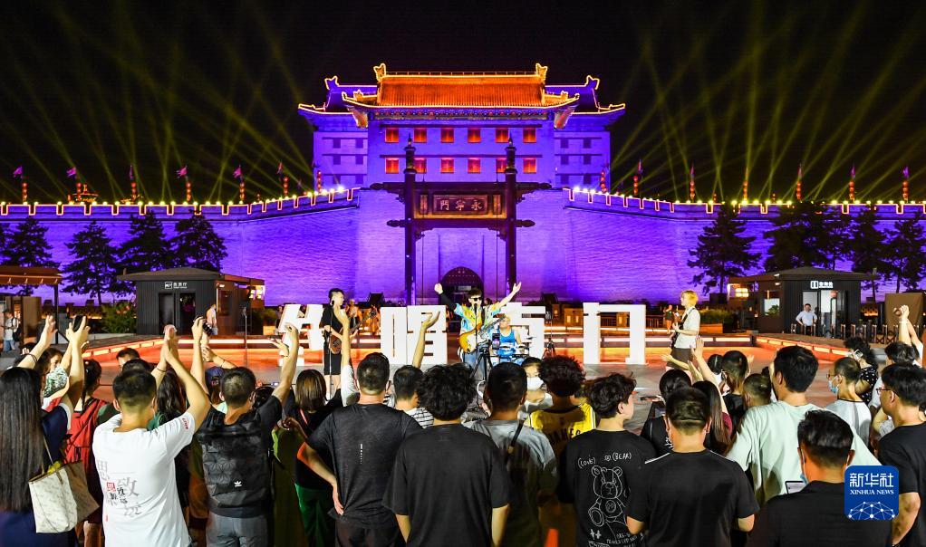 游客在西安城墻永寧門(mén)廣場(chǎng)欣賞樂(lè )隊演出(2022年8月1日攝)。
