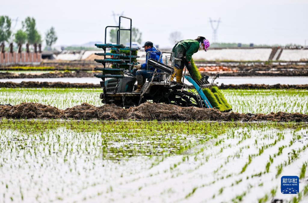 5月15日,農民駕駛插秧機在興安盟烏蘭浩特市的水稻田中插秧。
