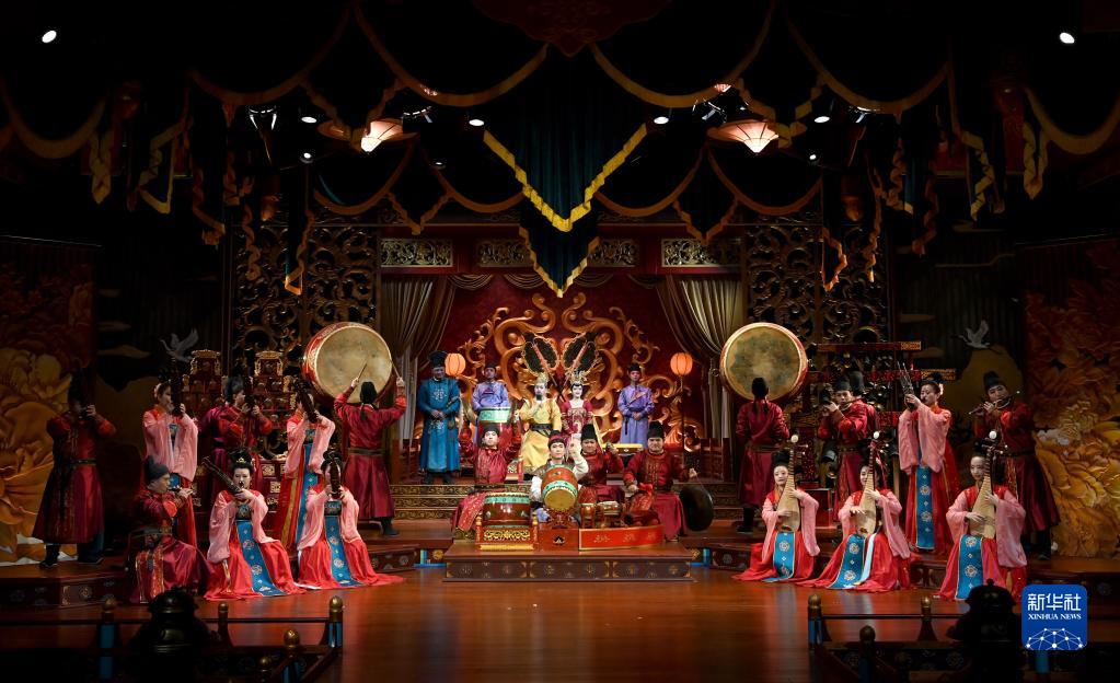 西安大唐芙蓉園內上演的舞臺劇《鼓》(1月24日攝)。