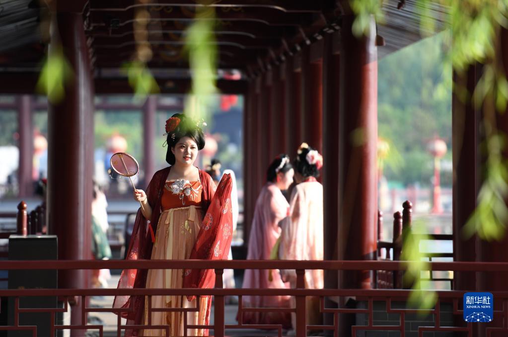 位于陜西西安城南的大唐芙蓉園,是在唐代芙蓉園遺址以北、仿照唐代皇家園林式樣重建的一座全方位展示盛唐風(fēng)貌的大型文化主題遺址公園。園內紫云樓館橋飛渡,彩霞亭煙波浮動(dòng),望春閣亭亭玉立……漫步其間,隨處可見(jiàn)身著(zhù)古裝的游客攜親友同行,在流動(dòng)的光影之間,恍若穿越千年。水舞燈光秀《大唐追夢(mèng)》、歌舞劇《夢(mèng)回大唐》、宮廷燕樂(lè )《鼓》等創(chuàng )新演藝也讓唐風(fēng)國韻在此散發(fā)經(jīng)久不衰的藝術(shù)魅力。