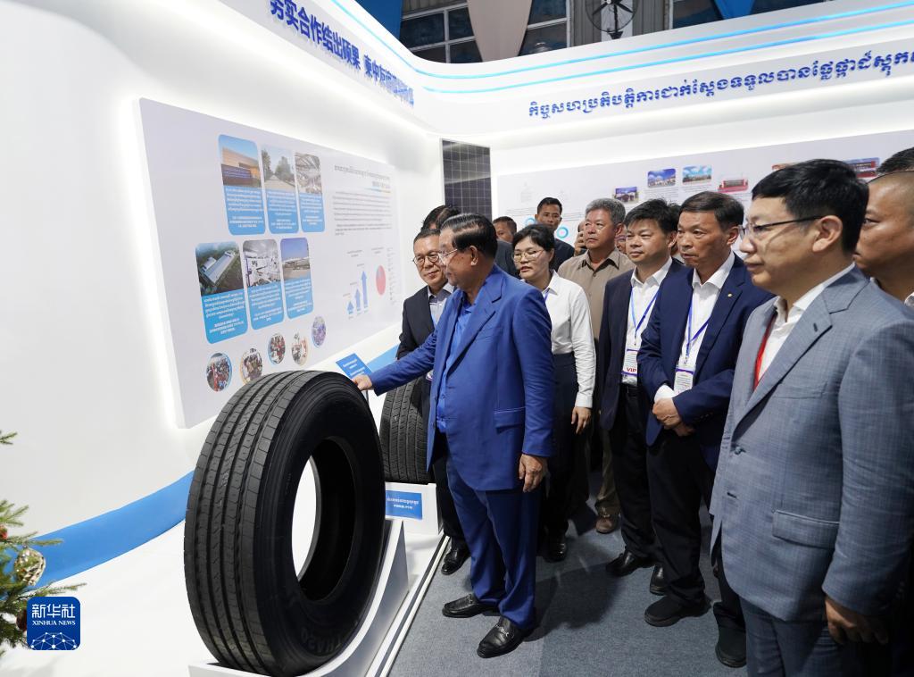 5月22日,柬埔寨首相洪森(前左)在西哈努克港經(jīng)濟特區參觀(guān)共建“一帶一路”倡議十周年西港特區成果展。新華社發(fā)(李萊 攝)