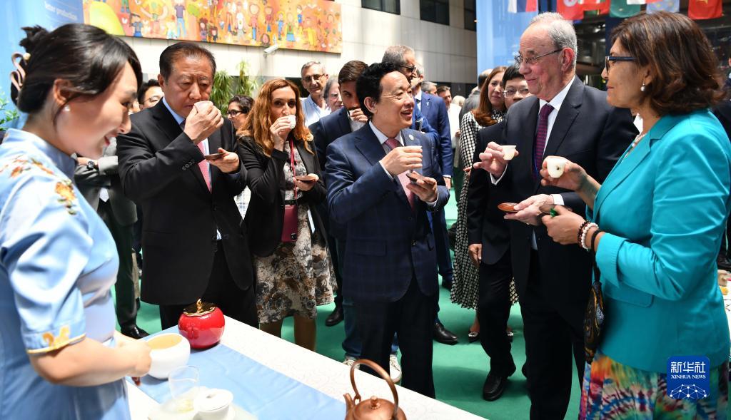 5月22日,在意大利羅馬的聯(lián)合國糧農組織總部,糧農組織總干事屈冬玉(中)等品嘗福建安溪鐵觀(guān)音茶。