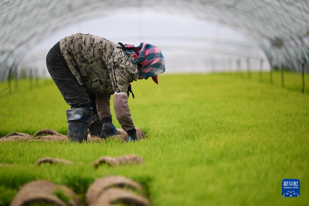 5月23日,達拉特旗昭君鎮村民在育秧苗大棚中起秧。