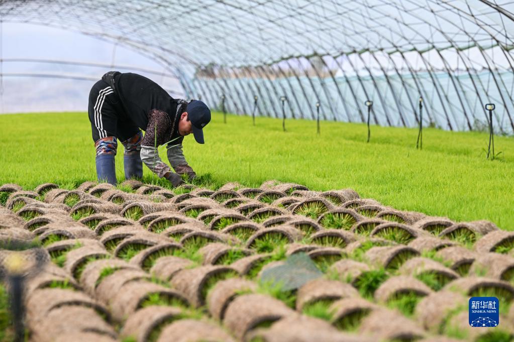 5月23日,達拉特旗昭君鎮村民在育秧苗大棚中起秧。