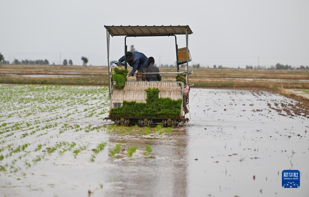 5月23日,達拉特旗昭君鎮村民在鹽堿地改良水稻田中使用農機插秧。