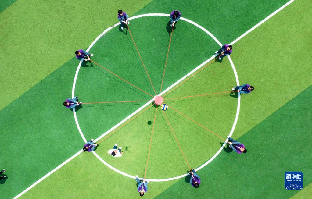 5月24日,貴州省黔西市樹(shù)立中學(xué)高三學(xué)生參加“同心擊鼓”游戲釋放壓力(無(wú)人機照片)。