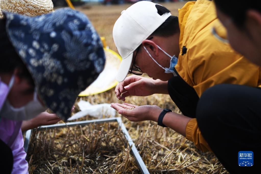 5月24日,在河南省南陽(yáng)市唐河縣的活動(dòng)現場(chǎng),工作人員在選定的采樣區域撿拾掉落的麥粒。