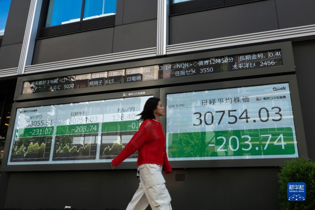 5月24日,行人走過(guò)日本東京街頭的證券實(shí)況看板。