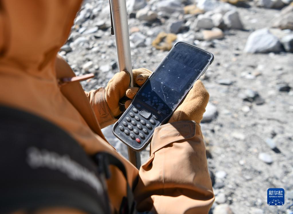 在珠峰海拔約5300米處,來(lái)自中國科學(xué)院西北生態(tài)環(huán)境資源研究院的科考隊員薛雨昂在對冰川進(jìn)行實(shí)時(shí)差分GPS定位(5月15日攝)。