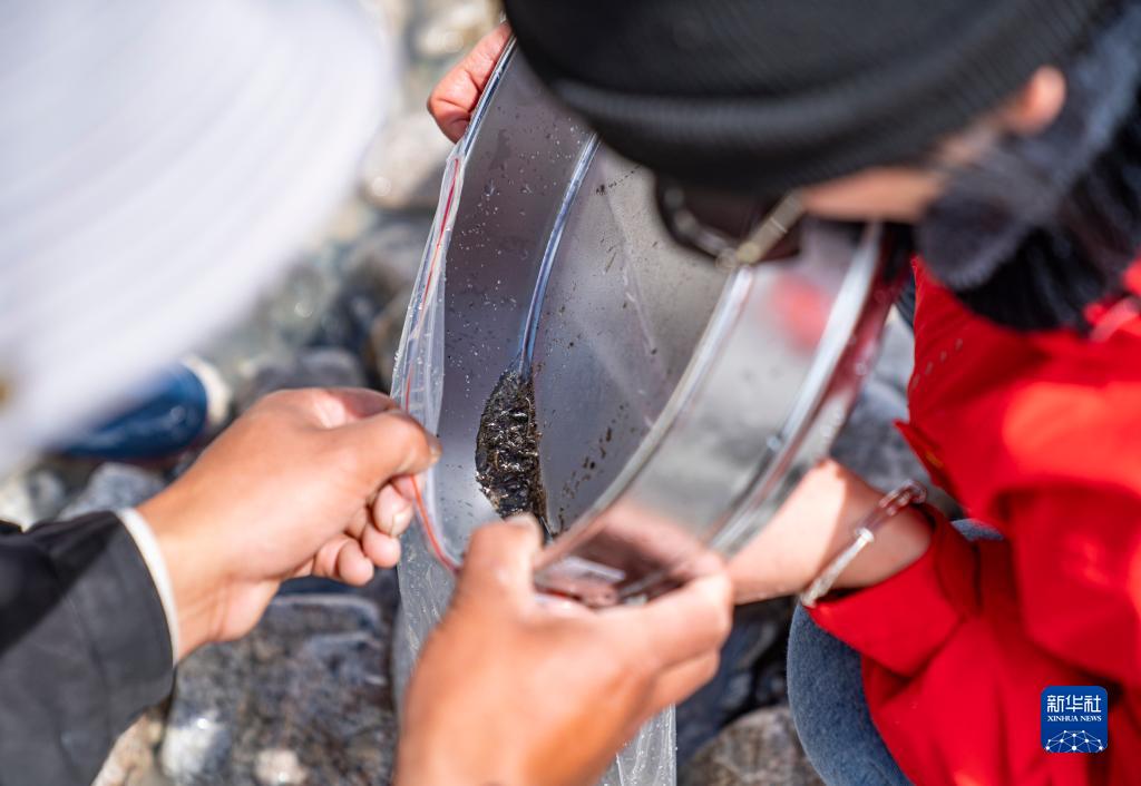 在珠峰登山大本營(yíng)附近,來(lái)自西藏大學(xué)生態(tài)環(huán)境學(xué)院的科考隊員在收集水生生物樣本(5月22日攝)。