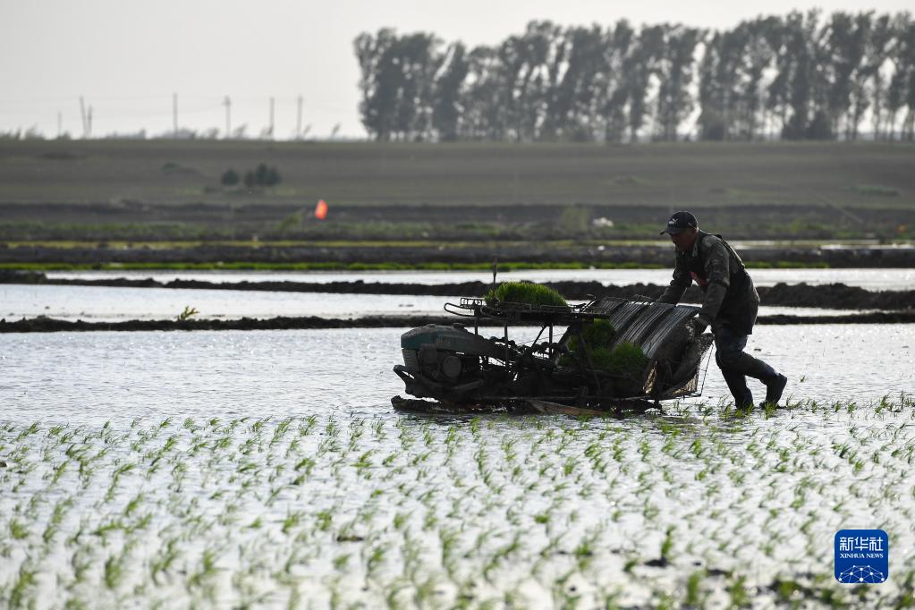 5月24日,農民在吉林省長(cháng)春市九臺區龍嘉街道紅光村操作農機進(jìn)行水稻插秧。