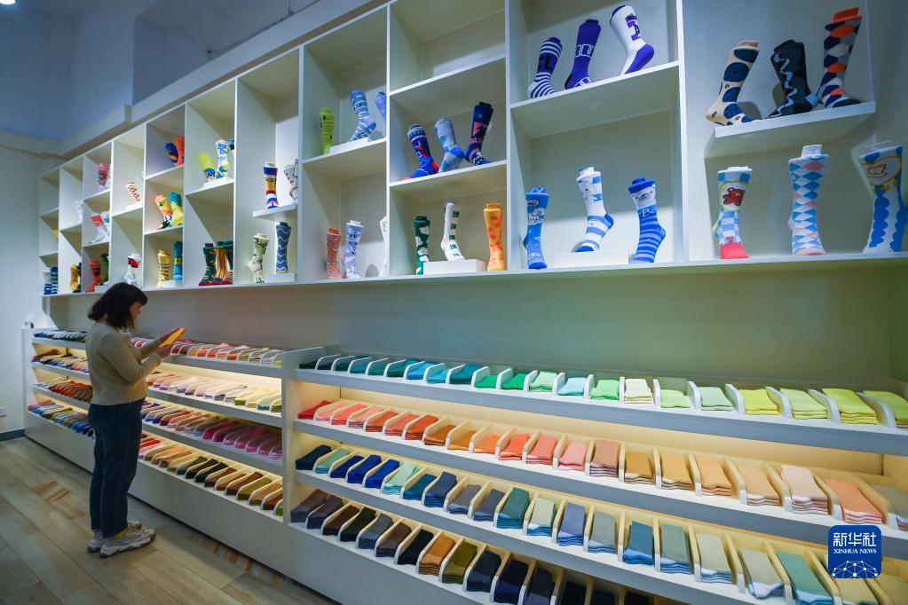 這是位于浙江省諸暨市大唐街道的浙江凱詩(shī)利科技有限公司展廳內展示的各類(lèi)潮襪,企業(yè)與眾多高校及設計機構合作,每年推出數千款潮流襪品(5月25日攝)。