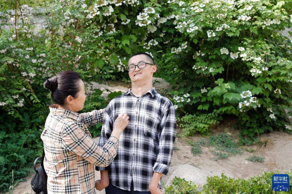 在蘭州大學(xué),母親劉小鳳幫謝炎廷整理衣服(5月12日攝)。新華社記者 方欣 攝